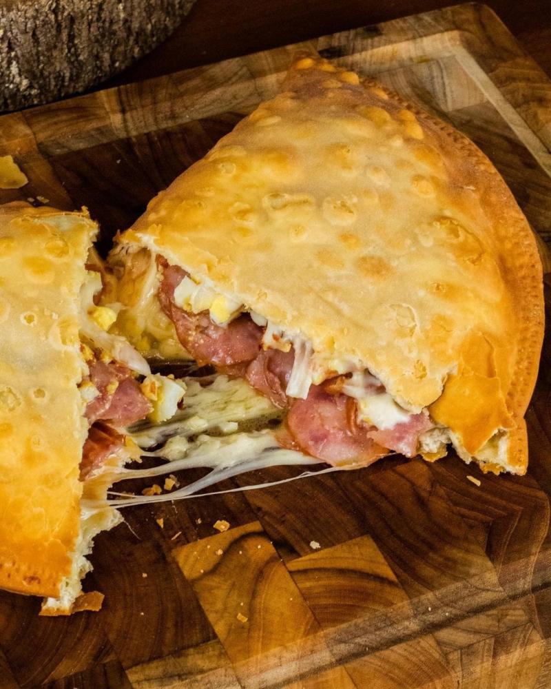 Molho, muçarela, requeijão, calabresa, ovo, cebola, pimenta calabresa e orégano.