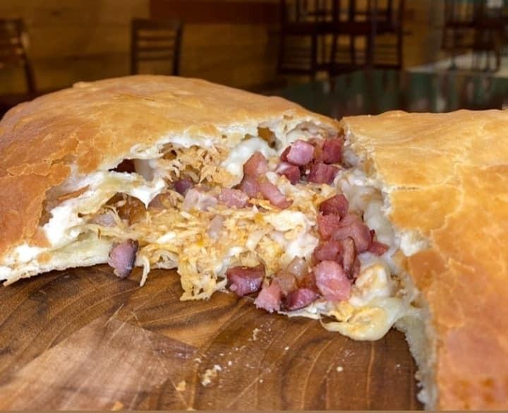 Molho, muçarela, requeijão, frango, bacon e orégano.