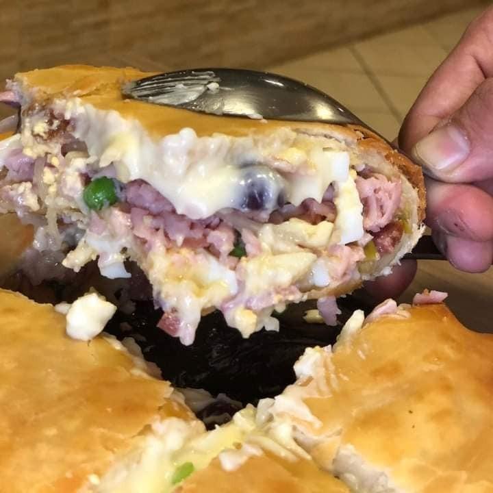Molho, muçarela, requeijão, presunto, bacon, ervilha, ovo, cebola, azeitona e orégano.